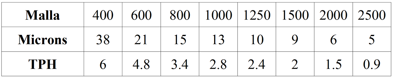 Quiero producir polvos con diferentes finuras, entre malla 400 y 2500. ¿Cuál es la capacidad de producción de cada uno?