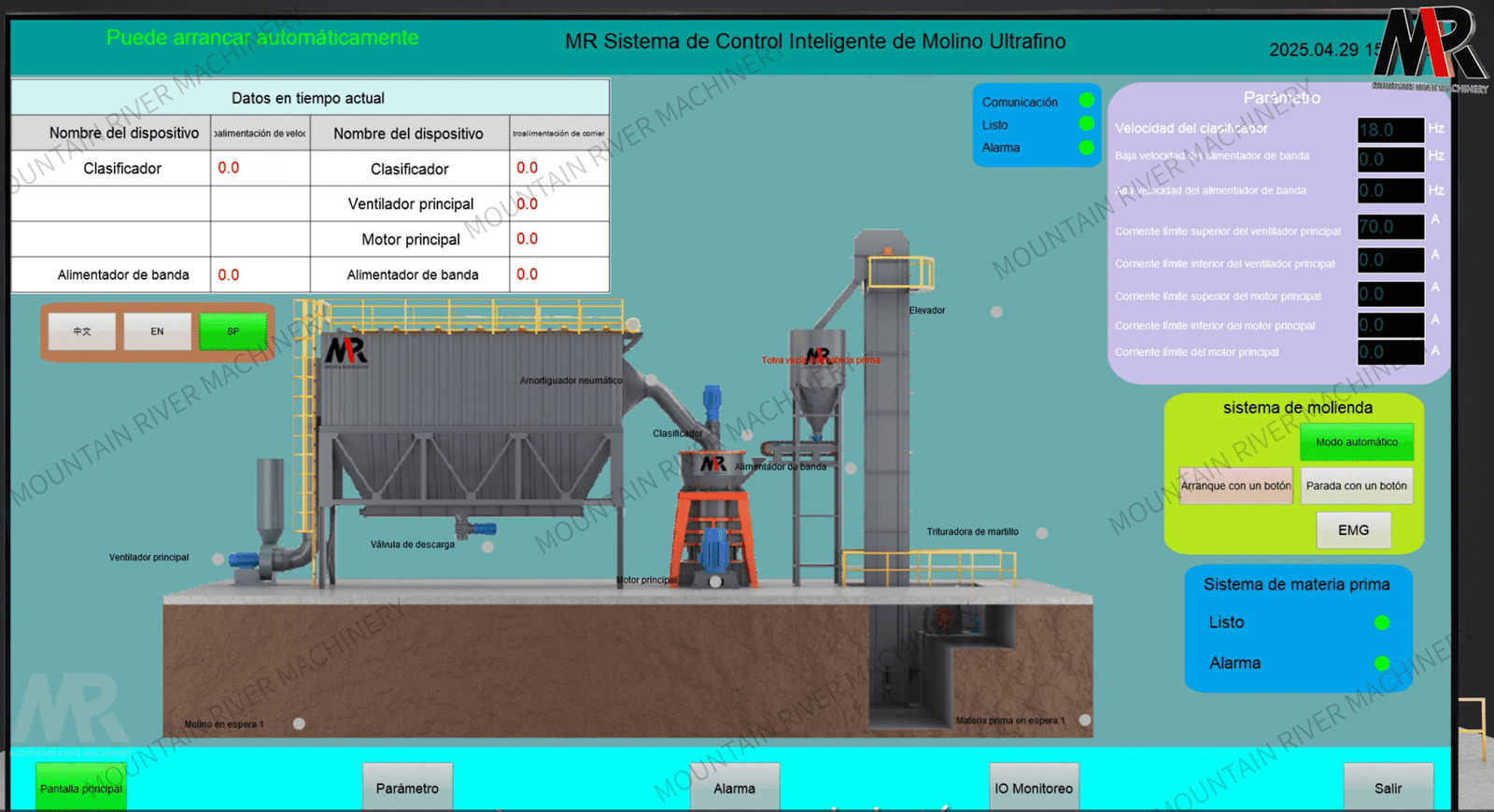 En comparación con el MSF800, el MSF1000 ofrece un mayor nivel de automatización. Mientras que el MSF800 se controla mediante una interfaz hombre-máquina PLC, el MSF1000 emplea un sistema dual con control por computadora y control manual integrados. Ofrece arranque con un solo botón y alarma y apagado automáticos por computadora en caso de avería. Además, logra un control interconectado del alimentador de banda con faldón, la unidad principal del molino y el soplador principal, ajustando automática y uniformemente la velocidad de alimentación en función de la corriente del soplador principal para maximizar la eficiencia de molienda. Además, incluye un botón de control manual para mayor seguridad. También está disponible una aplicación móvil que permite supervisar el estado de producción del equipo en cualquier momento y lugar.
